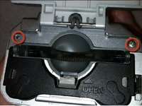 • During reassembly, the holes for these screws must align properly with the interior of the camera body. Then the black battery cover must lie flat and be held in place by the grey tab.