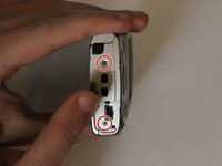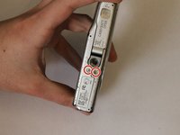 • Remove the 6 Phillips #00 exterior screws from the camera. Two are located on the bottom and two are located on either side as shown. Notice that one of the screws is under the AV Out Digital flap on the side. All exterior screws should be 2.4mm in length