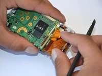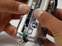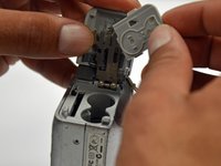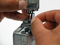 Gently lift the LCD screen off of the front casing by pulling up a tab on the side of the camera.