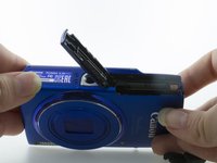 With the backplate removed, turn the camera so that the CARD/BATT. OPEN door is face up and to the right. Press down on the door as you slide it to the right. You should hear a click which indicates that the door is unlocked and will freely open.
