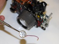 Disconnect the speaker wires from the camera, then use a small flat head screw driver to lift the speaker out of its housing.
