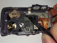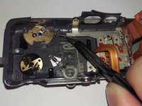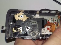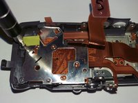 With the top panel removed, locate the metal plate covering the zoom control on the underside of the panel (located on the forward left side, if the panel is oriented similarly to the first image.) This plate will also be connected to some circuit ribbon. Leave the ribbon attached to the plate.