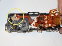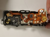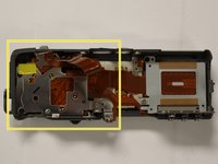 With the top panel and metal plate removed, locate the zoom control on the underside of the panel (located on the forward left side if the panel is oriented similarly to the first image.) It will be located directly under the metal plate and circuit ribbon that was removed in the previous step.