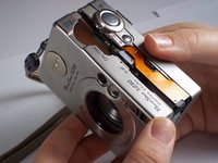 On the bottom of the camera, use your thumb to press the rubber battery cover towards the side of the camera with the strap base. The cover will shift to extend beyond the rest of the camera.
