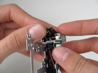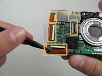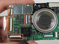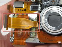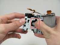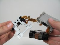 Lift the zoom lens away from the left portion of the camera so that there are three components connected by a ribbon cables.