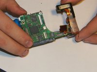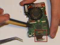 The screen is now connected only by a small cable that runs to the rear board of the camera. Using tweezers, slowly pull the cable out of the connector.