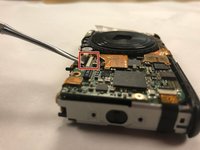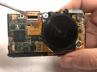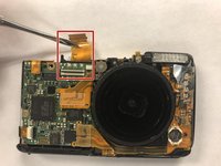 Unplug the small chip from the face of the camera by carefully inserting the metal spudger underneath the cluster of red wires visible. Then lift the cluster of wires upwards, parallel to the front face of the camera.
