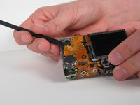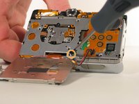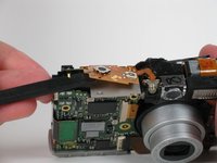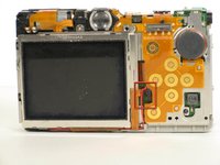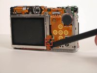 Use the flat end of the spudger to peel back the orange ribbon cable on the top of the camera where the power button contact is located. Only apply enough force to lift the power button contact up from the rest of the camera.