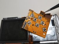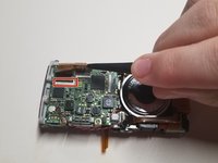 Lift up the button that connects to the power button of the camera so you can remove the control panel.