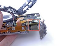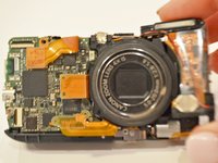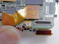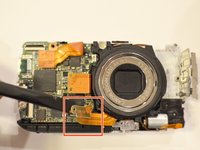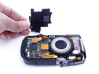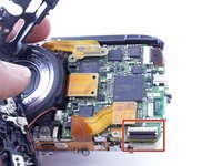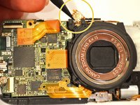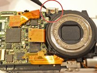 From the top of the camera, detach the flash assembly ribbon behind the flash bulb using the point of the spudger or small tweezers.