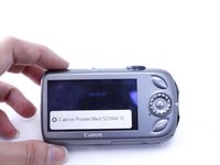 Using a Philips 000 screwdriver, remove the 5-(2.7mm long) screws from the silver plate that the lens is mounted to on the back (screen side) of the camera.