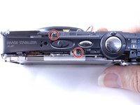 Remove two 3.2mm PH000 screws on the side of the camera, to the right of the button that reads "Func. Set."