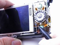 To remove the casing around the LCD screen, begin by removing the top of the casing (which is in two pieces). First, remove the small hinge on the right side.