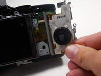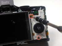 Unscrew the 3-3.75mm silver screws from the function wheel panel of the camera using a #0 Phillips head screw driver.