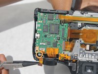 Remove the 2mm #00 Phillips head screw on the lower left corner of the motherboard. The motherboard should now lift free from the plastic frame.