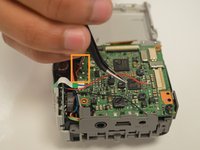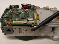 After disconnecting all ribbons, lift the motherboard to expose the ribbon cable connecting the motherboard to the lens.