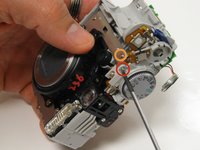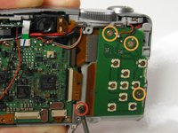 Turn the camera over and unscrew 4.5 mm Phillips head screw to detach the shutter button and settings dial from the rest of the camera.