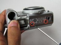 Use the Phillips #00 precision screwdriver to remove the innermost 4 mm Phillips head screw. Remove the door from the camera.