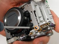 Turn the camera to the lens facing up. Remove the 3 mm Phillips head screw attached the bottom of the battery housing unit to the lens.