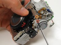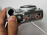Turn the camera over and remove the 4.5 mm screw that is next to the settings dial using a Phillips #00 screwdriver.