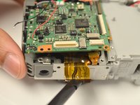 After all of the ribbons have been disconnected, gently lift the motherboard to expose the ribbon cable that connects the motherboard to the lens.