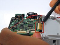 Use the spudger to remove the the ribbon cable attached to the motherboard. Be sure to alternate pressure to both sides of ribbon cable to evenly remove.