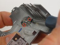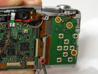 In the front panel remove the two 2.5mm Phillips head screws attached to the shutter button.