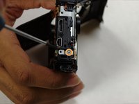 Remove the two screws on the side of the camera on either side of the HDMI input panel.