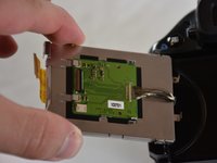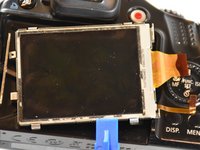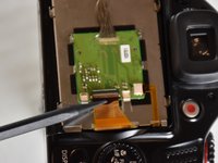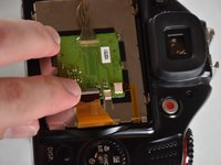 Unscrew the 3mm screw on the inner edge of the panel. This is easily done by rotating the screen to be perpendicular to the body of the camera, but be careful not to damage the wires or the circuit board.