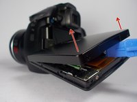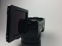 Partially close the screen and rotate it 90 degrees until the screen is facing upwards (photo view from the left front of the camera). Remove the 4mm black screw, indicated in the picture, with a Phillips #00 screwdriver.