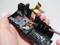 Remove one 4mm Phillips JIS#00 screw located on the top of the camera near the battery connection.