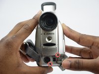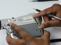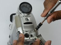 There is one 3.35 mm screw located under the tape cassette panel on the front left side of the camcorder. Remove the screw.