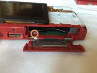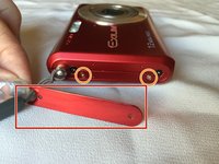Remove this screw to take off the red plastic piece on the bottom of the camera. This is a red-orange tipped screw but is a smaller size than all the other ones.