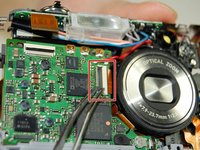 Locate the logic board to the left of the lens. You will see a bar securing a ribbon. Flip the bar up to release the ribbon.