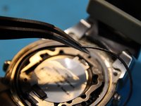 Use the tweezers to remove the plastic ring that aligns the movement.