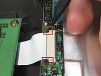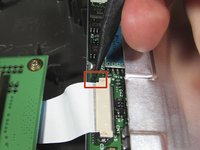 Use the spudger to disconnect the ribbon cable from the display by the black pins away from the connector. There is a pin on either side of the connector.