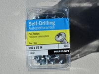 Use a power drill and the #10 x 1/2 self-drilling sheet metal screws to secure each corner of the replacement sheet metal.