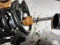 Hold the center shaft of the strut with a 3/8" wrench while removing the nut at the top of the strut with an 18mm wrench.