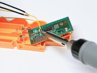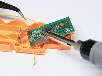 Using a soldering iron, solder the yellow wires of the new speaker to the mainboard.