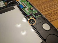 Locate the battery connector. With the large silver/black battery facing you, the connector is just above it, in the middle-left. But first we must remove some tape.