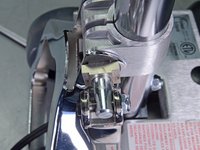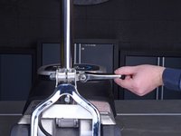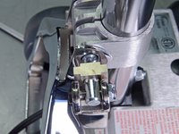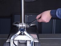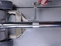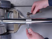 Tilt the handle back up and use a 1/2" socket and socket wrench to remove the two bolts and one nut securing the handle to the floor buffer: