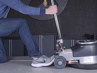 Brace the back of the floor buffer with your foot near the wheel axle and grasp the handle with both hands.