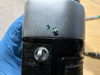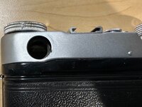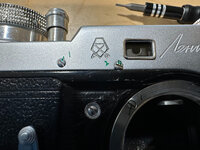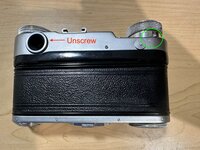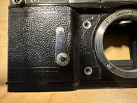 The shutter button screw is not pictured. It is on the front side of the camera as indicated by the green dashed arrow.