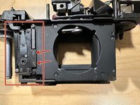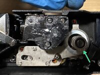 The self timer mechanism is now accessible. If needed, remove the two screws securing it (red arrow) to service it.