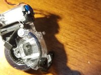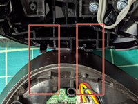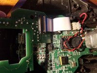 The scroll wheel assembly is held in with two P0 screws at the front. There's also a connector for the motor hiding under the ribbon cable for the PCB you just removed.