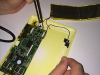 Desolder wires connecting battery to motherboard, using contact points found on motherboard.