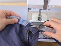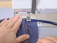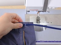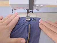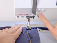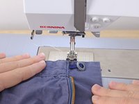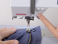 Holding the ribbon in place, slide the garment into the sewing machine, aligning the presser foot with the place you want the button to sit.