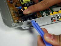 Place the plastic opening tool underneath the circuit board, and lift up genttly. As you lift up, slide the circuitboard in a direction away from the AVI ports.