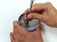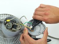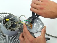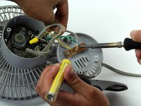 Start with the fan on its back. Unscrew the back panel to expose the internal wiring.