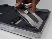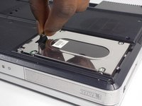 Grasp the black Mylar tab on the hard drive frame and pull firmly straight up until the hard drive disconnects from the computer, and remove it.